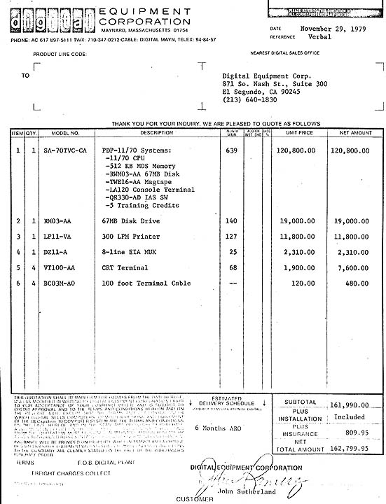 Price quote for a DEC PDP-11/70 system.![]()