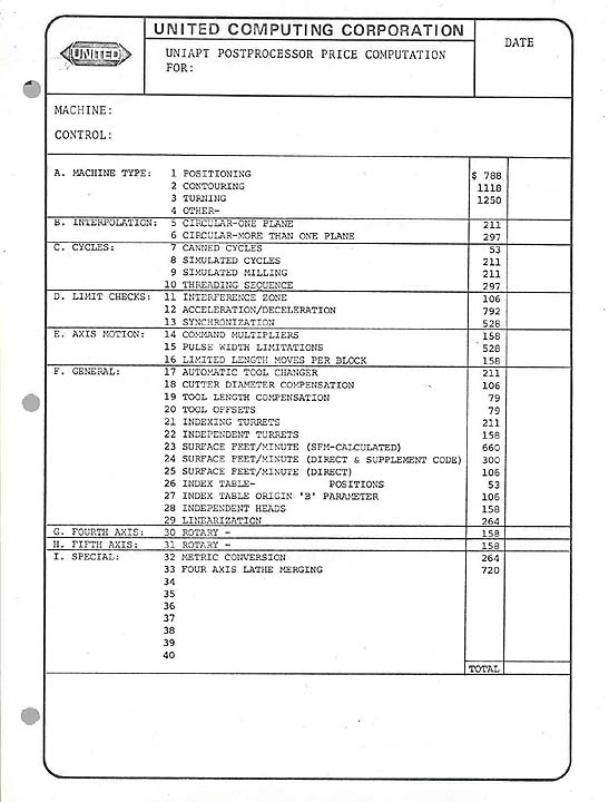 UniAPT Postprocessor Price List (circa 1974)