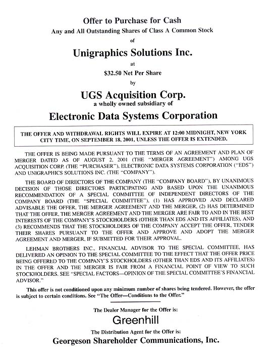 EDS Tender Offer for UGS Shares, September 2001![]()
