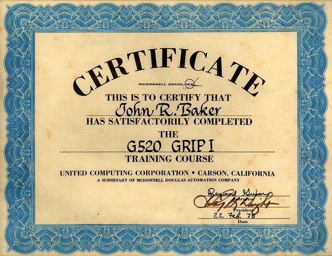United Computing GRIP Training Certificate (circa 1978)![]()