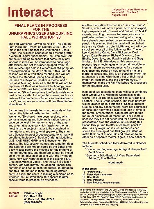 This issue included a preview of of the upcoming Fall Workshop '90 coming up in Boston, MA. The issue included a series of user interviews as well as an update of the current regional user groups. There was also a section covering user hints.