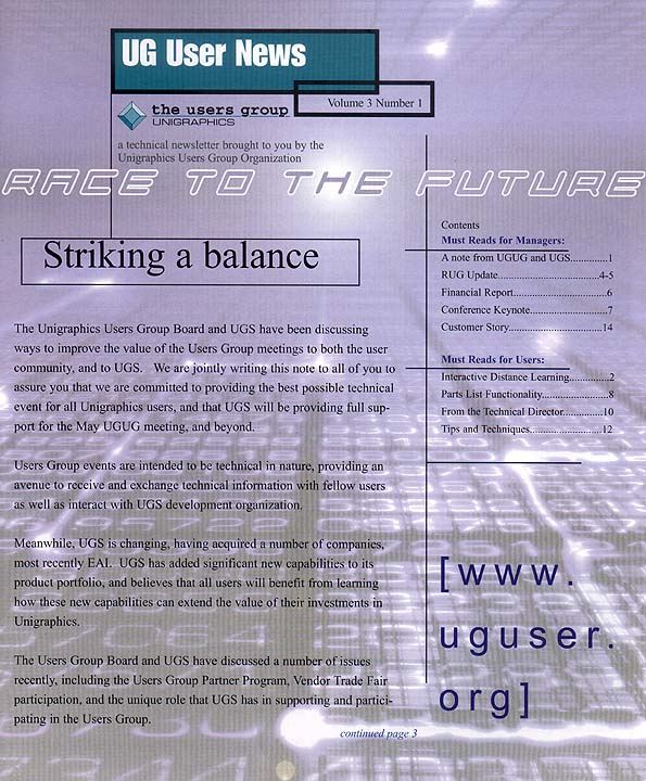This issue provided an update on the recent discussion of the relationship between the Users Group and UGS. There was also an update of the Regional User Groups as well as a calendar of events for 2001.