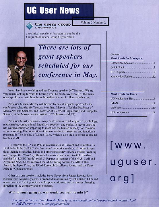 This issue provided a review of the upcoming National Users Group Meeting in Orlando and some of the highlights of planned events. There was also an update of the Regional User Groups and their current activities. There was even an item promoting the Unigraphics Virtual Museum.