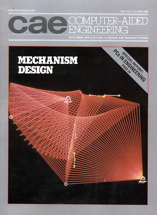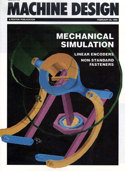 Another cover story on mechanical simulation and analysis. This time the cover image was of the results of a 4-bar mechanism kinematics analysis using Unigraphics Mechanism module. Computer-Aided Engineering Cover, June, 1986