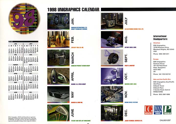 The 1998 Calendar was unique in that it never really had a company name on it (true there was a reference to EDS in the copyright block, but that was all). The thing was that the company knew that they were being spun off from EDS after the first of the year and that there was going to be an IPO and a new name, the problem was that the calendar was going to be coming out at the end of 1997 and they did not want to have to reprint the calendar half-way through the new year so it was decided to not have the company name displayed anywhere (except as noted above). Therefore there is no "EDS Unigraphics" displayed as in years past and of course since the name "Unigraphics Solutions" had not yet been decided upon so that couldn't be used either, only the name Unigraphics was displayed on the front and rear covers. 1998 Unigraphics Calendar