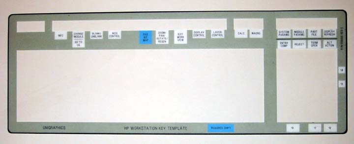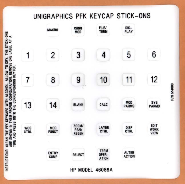 When Unigraphics first started to use HP workstations and before proper keyboard overlays were available, special keycap "stick-on's" were created that could be stuck onto the HP supplied PFK's.