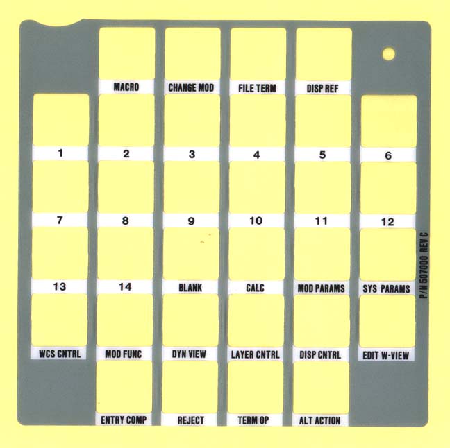 There was even an optional overlay that could be used with certain data tablets (such as the IBM one above) that allowed a user to select options from a schematic of the standard PFK layout using a puck. While this was not a particularly popular option, it was used at several Unigraphics customer sites.