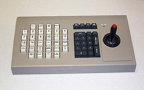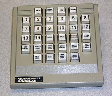 Unigraphics metal encased PFK (circa 1982)This photo shows the first of the new lower profile, metal encased PFK that was introduced with the ADS/DDS workstations as well as the D90. This PFK did not use an overlay, rather the labels on the buttons were small plastic squares inserted into the clear plastic keys. Of course this meant that when users had to upgrade to UGII, they had to remove the inserts on those keys whose labels were changed and replace them with new ones. It was eventually replaced with a similar configuration except that the metal case was replaced with a more modern looking plastic housing. Also with this early version of this style PFK, the section holding the joy-stick could be replaced with an optional set of thumb wheels for those people that preferred them based on their previous use of the Tektronix 4014 terminals.