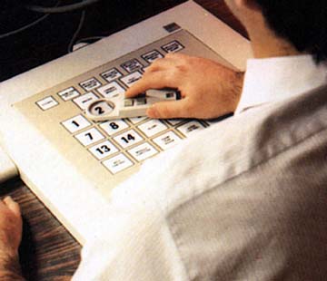 Here in the special exhibit, History of the PFK, you will find photos and information about the PFK (Programmed Function Keyboard). Even though the PFK is not supported by today's version of Unigraphics (and has not been since the release of V10.0) this exhibit should be of interest to many people since the PFK was a symbol of the product for years. Note that Unigraphics was not the only CAD application that used a PFK. At one time or another the following product all supported a PFK in one form or another: Catia, CADAM, CADD, NCAD, Gerber, etc.That being said, exactly what is a PFK. As the name implies, the Programmed Function Keyboard was used to select various functions by selecting a key on a special keyboard. There were 32 back-lighted buttons, with 14 buttons numbered and the remainder labeled with specific functions. This was in fact the entire user interface for early version of Unigraphics (pre-V10.0). What a user did was sit in front of a Unigraphics workstation and displayed on the message monitor (and later in a sub window of the main graphics screen) was a list of up to 14 options that the user could select by pushing on the 14 numbered buttons (the ones that were available for selection were lighted). Many of the non-numbered buttons we also available and when so, they were also lit. Those items that were on all of the time were called "Special Functions" and that approach is still used today in that these are the menu or toolbar items that are available when inside of an application such as Layer Control, Views & Layouts, Info, Blank/UnBlank, etc. Later on in this section there will be a review of the functions and what the menus look like for performing an example of a typical task in Unigraphics.