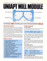 The unique thing about UNIAPT was that is was one of the first CAM products that was sold to the actual end users. Up until this time most companies created their NC programs using time-sharing services from large providers such as McAuto (McDonnell Douglas Automation, a subsidiary of McDonnell Douglas Corp) and UCC (University Computing Corporation). The versions of APT used by these companies were all running on large mainframes and the cost of programming, debugging and editing a program could be very expensive. UNIAPT provided a lower cost alternative for small to medium sized companies of the era. Early UNIAPT brochures are shown below (to see complete copies of these brochures, please visit the "Archives").